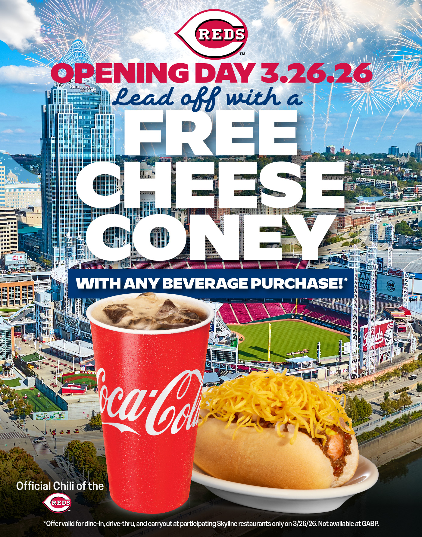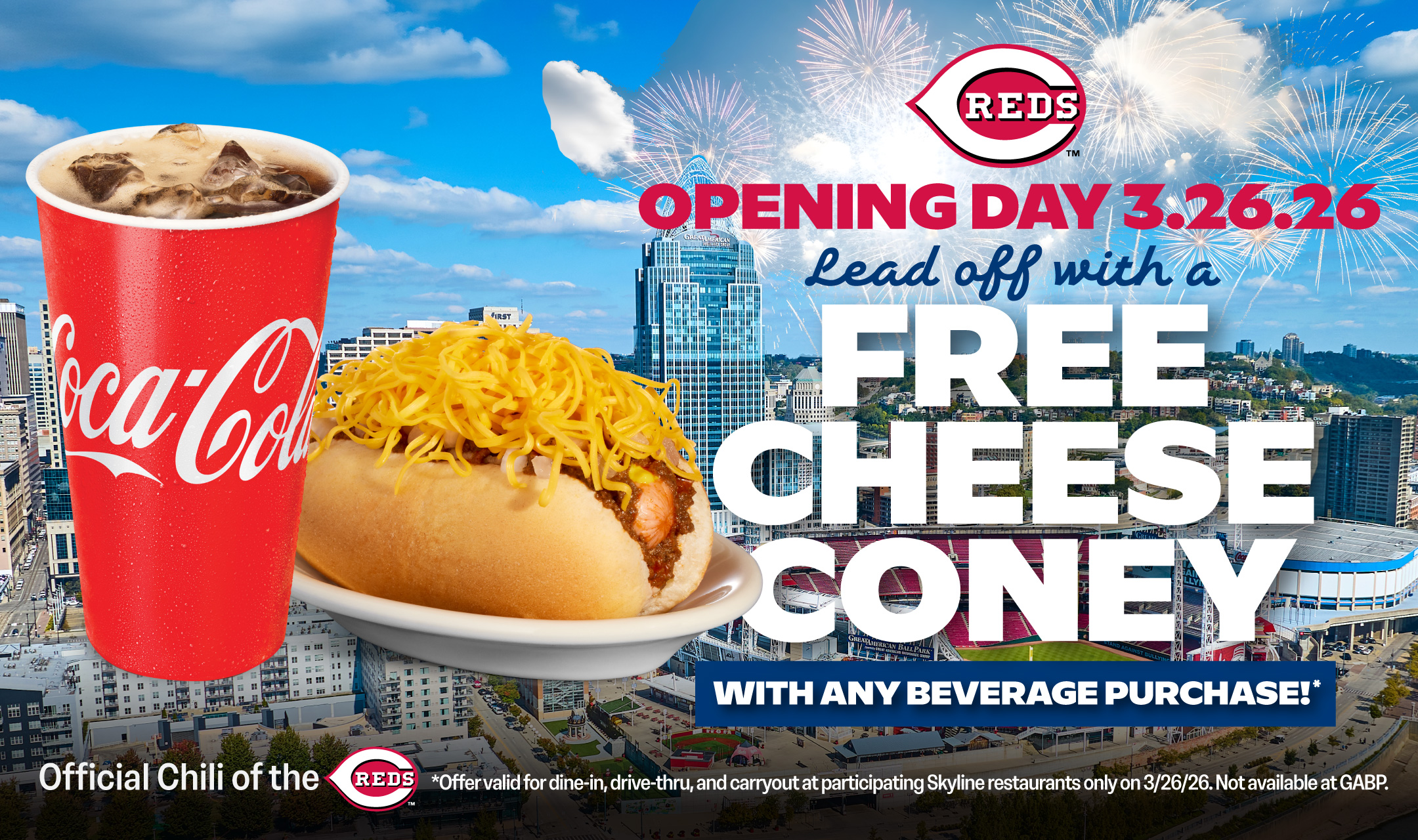 On Thursday, March 26, 2026, you can receive a free Cheese Coney with any beverage purchase at your neighborhood Skyline Chili or our Skyline pop up on Fountain Square!